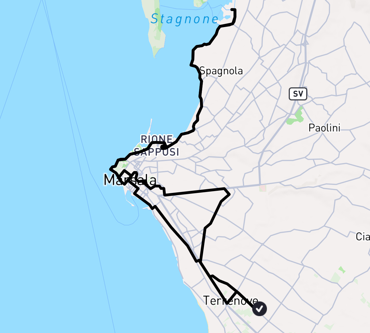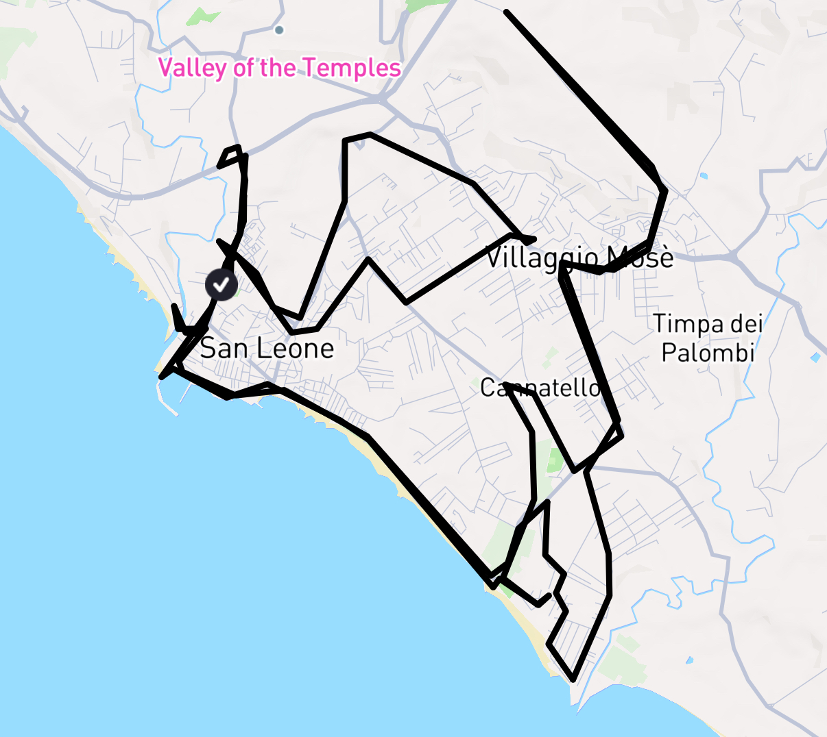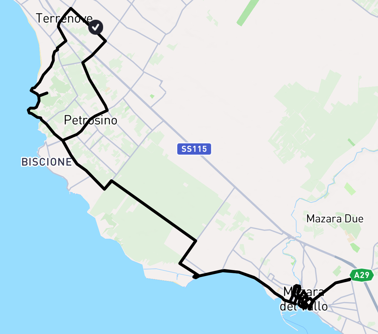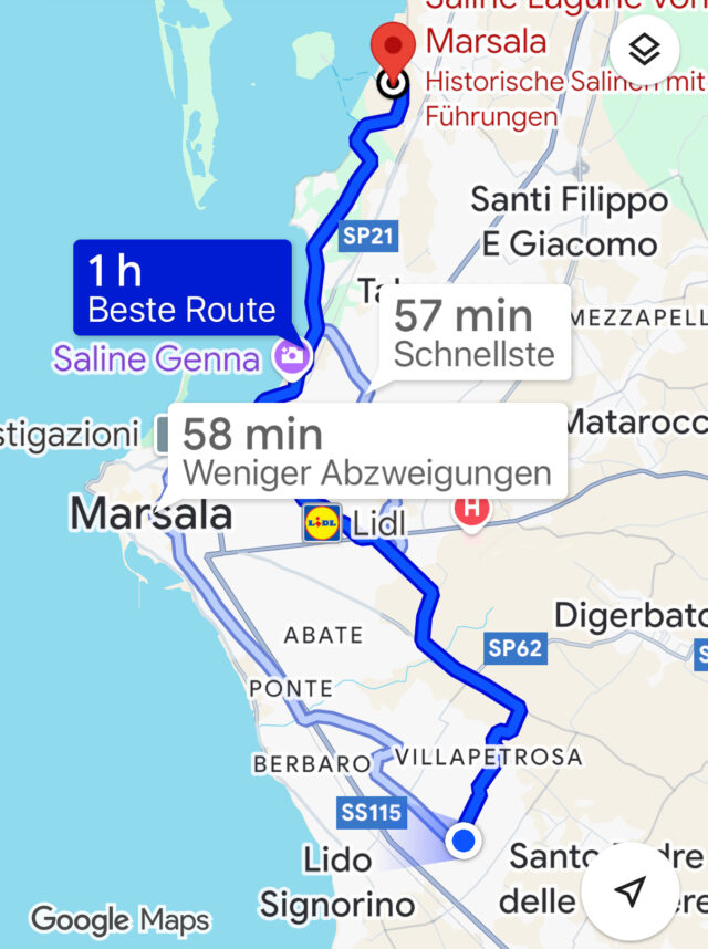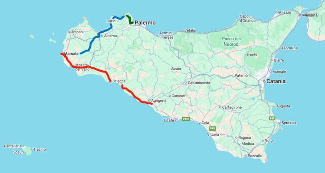 [click/touch the pic] Nach einem Tipp von Ruth aus Nettuno fahren wir heute nach Mazara del Vallo. Wir versuchen, zumindest auf dem Hinweg möglichst nah am Meer zu fahren.