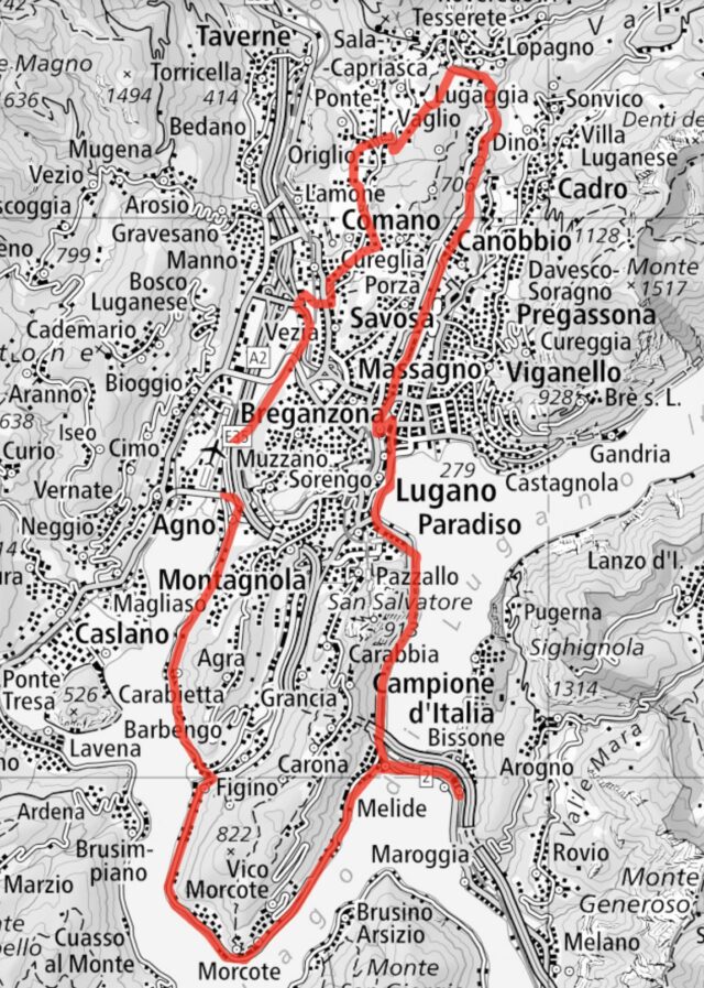 Zersch simmer über Figino noch Morcote gfahre, hend churz drvor ufem Hoger obe vermuetlich es erscht Moll e Castello gsääh – jo, es Pöschtli mit sinere Terasse uf em erschte Stock isch immer no schöö – und sind denn z’Melide über de Damm uf Bissone und wieder zrugg und wiiter uf Lugano gfahre und hend am Gestade z’Mittag ggässe. Denn simmer di grässlich Strooss (bis Canobbio) und denn uf de ehemalige Trasse vom Lugano – Tesseret-Bähnli ebe uf Tesserete ue – und über de Origlio-See durab und durab und würkli immer durab bis is Tal abe und durfüre haam gfahre – 47 km.